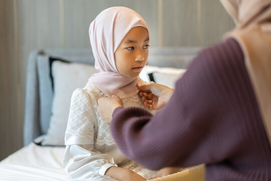 Mother Adjusting Young Girl's Hijab for Cultural Event or Celebration