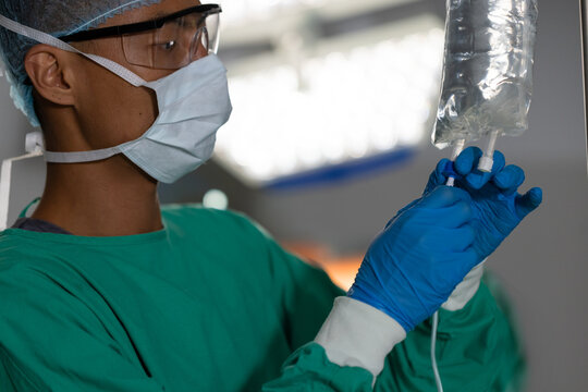 Surgeon adjusting iv drip during surgery in operating theater