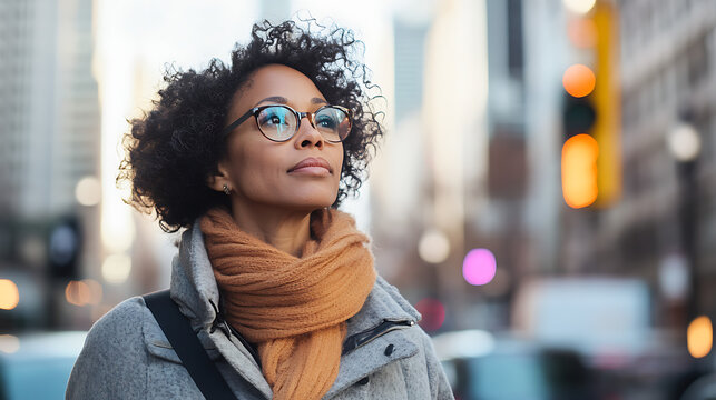 Smiling woman in stylish jacket exuding confidence