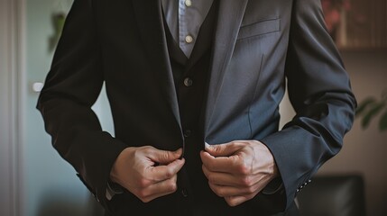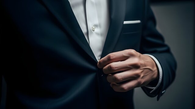 A man in a suit adjusting his jacket with a white shirt underneath visible partially