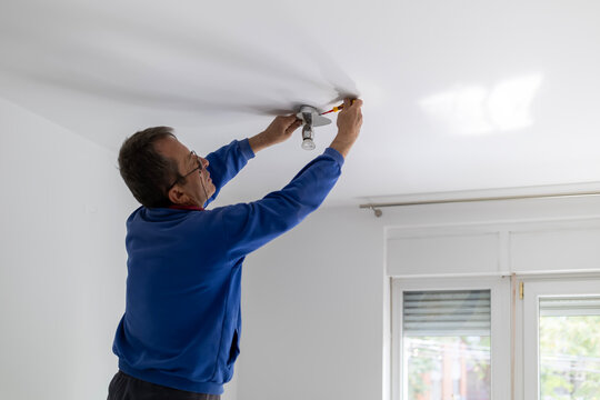 Ceiling light installation. Electrician installing, adjusting electrical lamp during home renovation. Worker on ladder fixing overhead lightbulb. An electrician. Repair work.