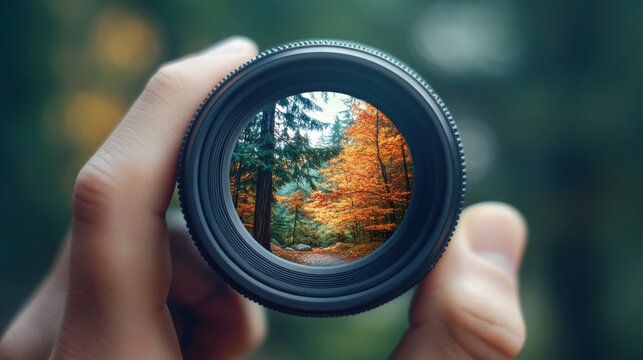 Close-up of hand holding camera lens against blurred green background