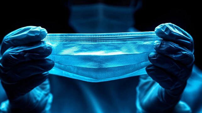 Surgeon adjusting mask straps in operating room with blue scrubs and ecg waveform overlay