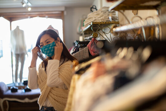 Asian woman in blue shirt adjusting a pink protective mask, appearing focused as she prepares to go outdoors