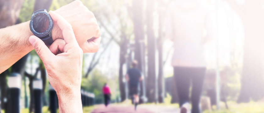 Close up shot of man hand  using smartwatch to track her workout performance.