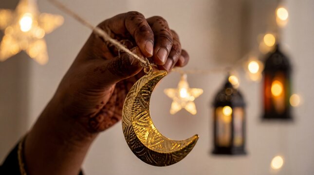 Close-up of a hand adjusting a golden crescent moon ornament on a string for Ramadan