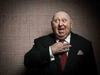 Stylish bald black man in a turquoise suit, against a colorful wall, adjusting his jacket.