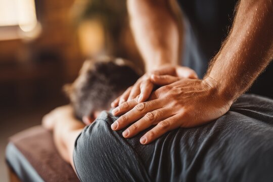 Hands adjusting patient posture during therapeutic session, showcasing close up view of interaction. focus is on gentle touch and care involved in process