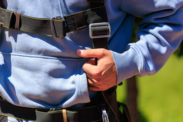 A dedicated worker meticulously adjusts his safety harness and work overalls preparing for a demanding day on a sunlit construction site