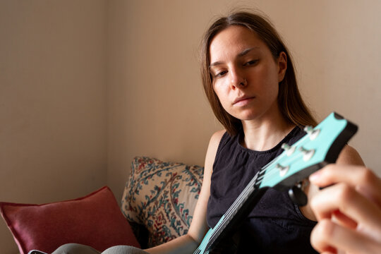 A young woman adjusting the strings of a blue ukulele, symbolizing musical practice, creativity, focus, leisure, and artistic expression.