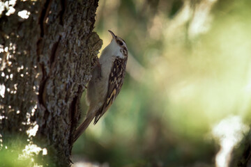 Eurasian treecreeper (Certhia familiaris) tight sitting on a tree bark of pine tree in spring forest
