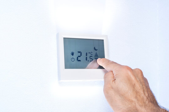 Thermostat in a modern home, utilizing smart technology to learn household schedules and preferences, automatically adjusting temperature for comfort and energy savings.