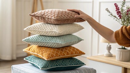 A stack of five textured cushions in various pastel and neutral shades, arranged against a simple background with a hand reaching in to adjust the top pillow