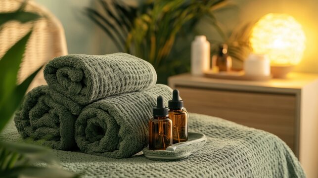Massage room corner with folded robes, slippers, and essential oils for a pampering session