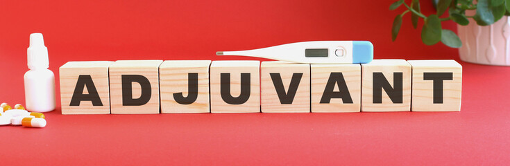 The word ADJUVANT is made of wooden cubes on a red background. Medical concept.