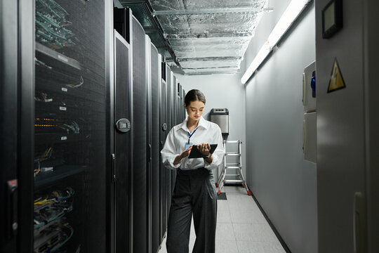 IT specialist in a white shirt focuses on her tasks in a sleek server room with advanced technology.