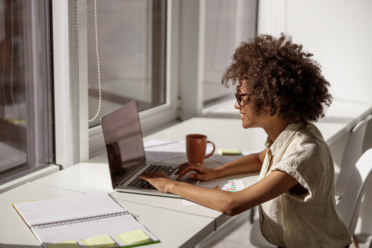 Portrait of young 25s African businesswoman, project manager or administrative worker posing in modern coworking office next to white wall board with plan, strategy, to-do list, insights or schedule