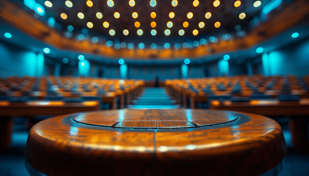 Vibrant image of empty parliamentary with rows of seats and a central aisle leading to a stage, illuminated by ceiling spotlights, concept for the International Day of Parliamentarism