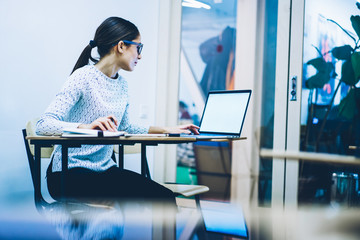 Young concentrated female manager browsing web page on netbook with blank screen searching information for job,clever student doing homework task on laptop computer autodidactic via online courses