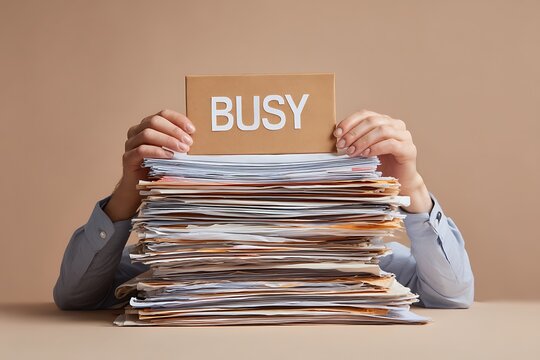 Hands holding a "BUSY" sign above a towering stack of documents, symbolizing overwhelming workload, burnout, administrative burden, and office stress.