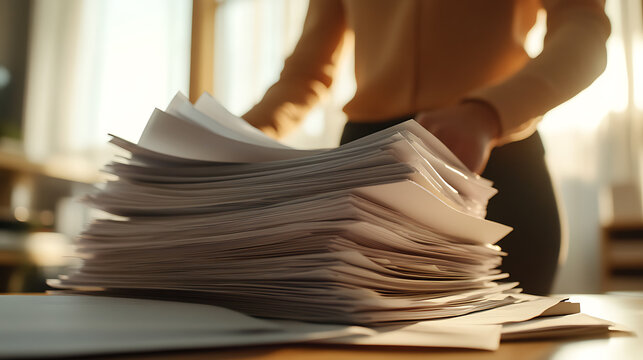A person sorts through a substantial pile of paper documents in a brightly lit room, perhaps in an office or home, highlighting the workload and administrative tasks involved.