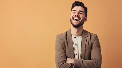 portrait of a brown hair man with big smile and beige background