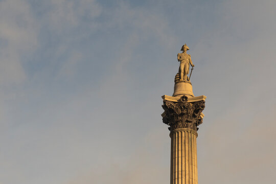 Famous statue of Admiral Nelson on Trafalgar Square in London, UK, on blue clear sky.
