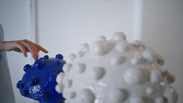 Woman hand touching ceramic sculpture closeup. Client visiting art decoration
