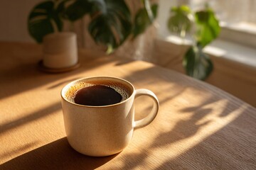 Freshly brewed coffee in ceramic mug on rustic table