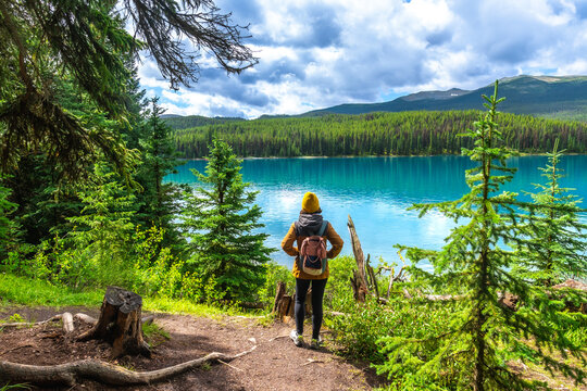 Hiker admiring breathtaking lake and mountain view in the alps