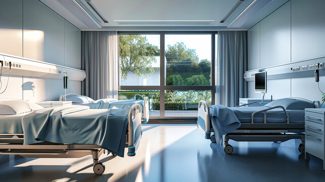 A hospital room featuring two beds and a window, offering a glimpse of the outside world in a place of healing and recovery