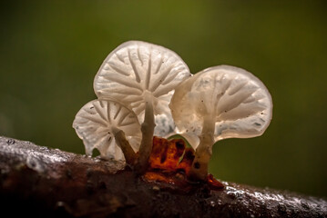Side view of the  porcelain fungus (Mucidula mucida) mushroom, with green bokeh, attached to a log.