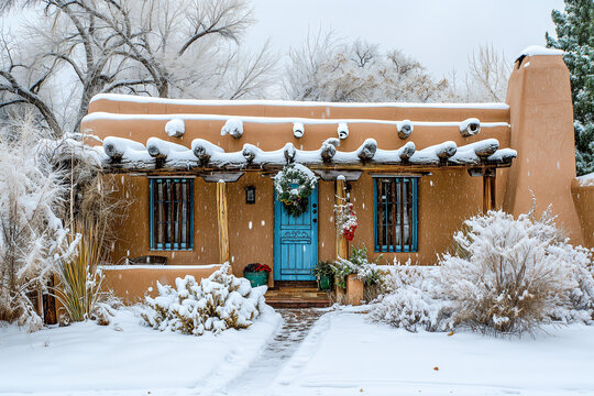 Traditional Santa Fe-style adobe house with a turquoise door and red ristra, blanketed in fresh snow under a gray winter sky