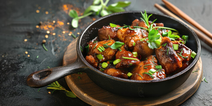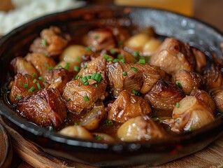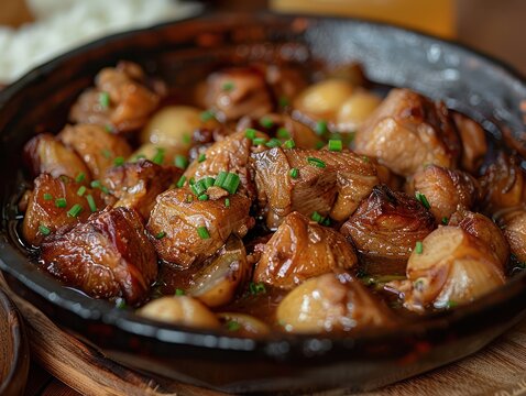 Filipino Pork Adobo Cuisine in a plate in a table