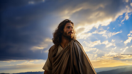 Jesus Christ looking up toward the sky. A portrait of the Savior during his ministry years. dramatic skies.
