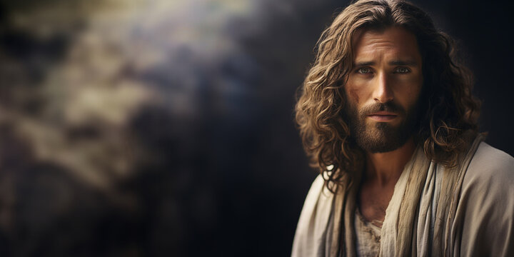 A young Jesus Christ looks into the camera. Portrait photography. Space for text.
