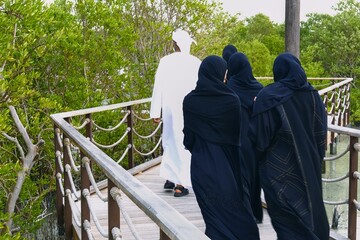 Traditional arab muslim family walking in mangrove park, Abu Dhabi, UAE. Ladies following man. Locals people with traditional arabic clothes, black Abaya for women and white Kandura for men.