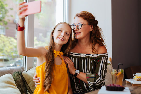 Teenage girl. Modern beautiful teenage girl making selfie with her loving caring mother wearing stylish blouse