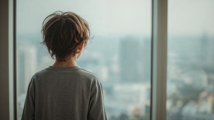 Back view of sad teenage boy looking out window at city skyline at sunset. Orphaned child waits for adoption, feeling lonely, longing for family. Pensive mood, childhood problems, social isolation,