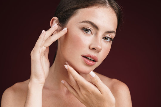 Young beautiful adorable girl in nude color lingerie posing isolated over pink studio background. Natural beauty, spa, cosmetics, fitness and aesthetic cosmetology concept.