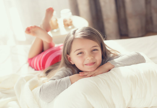 Little cute girl in pajamas sleeping in bed look at camera