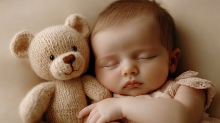 Sweet Dreams with Teddy: A precious newborn baby girl peacefully sleeps alongside her cuddly teddy bear, creating a heartwarming image of innocence, love.