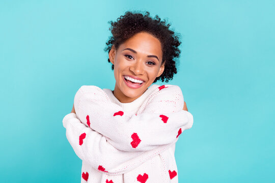 Photo of adorable shiny african lady dressed white sweater embracing herself smiling isolated blue color background