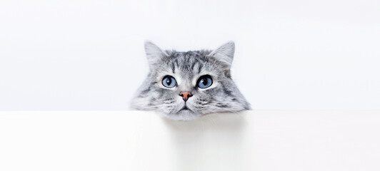 Funny large longhair gray tabby cute kitten with beautiful big blue eyes lying on white table. Pets and lifestyle concept. Lovely fluffy cat. Free space for text.
