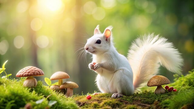 Adorable white squirrel in whimsical nature scene with mushrooms