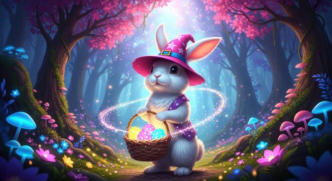 An adorable white rabbit, wearing a pink wizard hat and vest, carries a basket of colorful Easter eggs in a magical, blossoming forest path, surrounded by glowing mushrooms and flowers