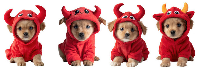 Four adorable puppies dressed in red devil costumes are sitting on a transparent background