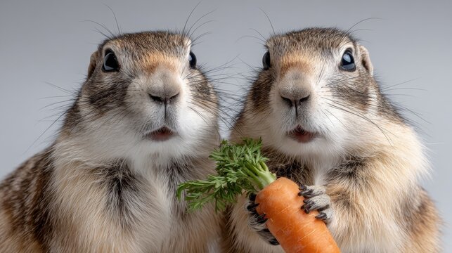 Two adorable rabbits with expressive faces, one holding a fresh carrot with green leaves, set against a soft gray background, showcasing their playful and curious nature in a delightful scene