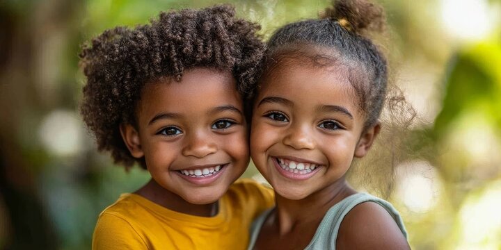 African brother and sister. Siblings bonding. Smiling black children hugging.