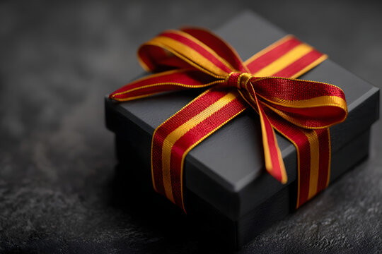 A luxurious black gift box adorned with a vibrant red and gold ribbon, resting elegantly on a sleek black surface, perfect for Valentine’s Day surprises.